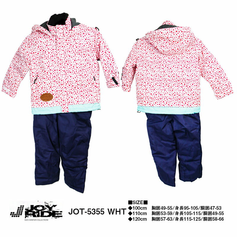 ジョイライド ■サイズ■ ◆100cm◆胸囲49-55/身長95-105/胴囲47-53 ◆110cm◆胸囲53-59/身長105-115/胴囲49-55 ◆120cm◆胸囲57-63/身長115-125/胴囲58-66 ●商品詳細 ■耐水圧2000mm ■サイズ調整機能付き 【ジャケット】 ■フード・ドローコード付き(取り外し不可) ■襟裏にはフリース素材を使用 ■前たてのファスナー部分からの風をシャットアウトするウインドプロテクト採用 ■左上腕部にマルチフック付き ■左腕にチケットホルダー(収納可能) 【パンツ】 ■ウエストにゴム入り ■サロペットタイプ ■パンツ両サイドにポケット付き ■スノーガード付き 【素材】 表地:ポリエステル100% 裏地:ポリエステル100% 中綿:ポリエステル100% モニターによって多少カラーが違って見える場合がございます。